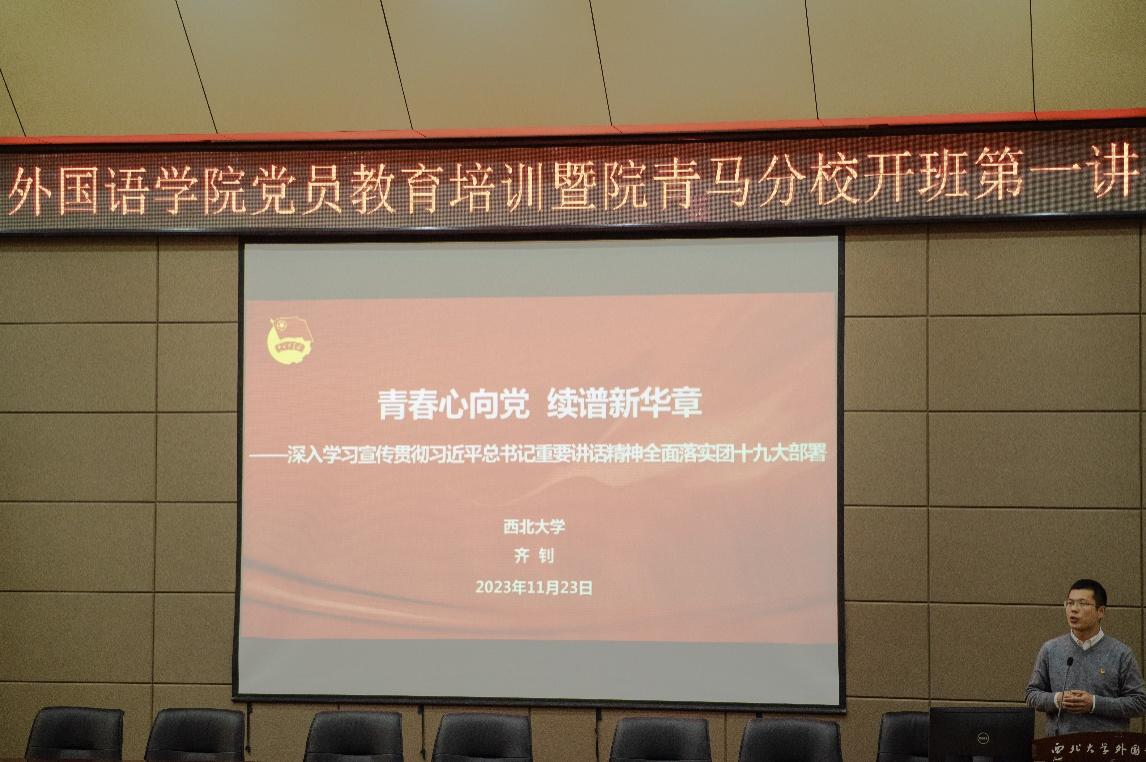 On the afternoon of November 23, 2023, the first lecture of the fourth session of the backbone training class for school students at the Young Marxists Branch of the School of Foreign Languages was held in the Second Lecture Hall. The event invited Mr. Qi Zhao, Deputy Secretary of the School Youth League Committee and Associate Professor of the School of Marxism, to deliver a thematic lecture entitled "Youth's Hearts towards the Party, Continuing the New Chapter of China — Deeply Studying, Propagating, and Implementing the Spirit of General Secretary Xi Jinping's Important Speech, and Fully Implementing the Deployments of the 19th National Congress of the Communist Youth League." All trainees of this session participated in the learning.