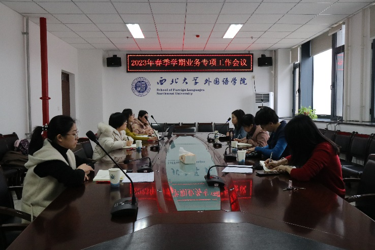 On February 17, 2023, at 2:30 p.m., a special meeting for the spring semester of 2023 was held in the school’s conference room. The meeting was chaired by Dean Cao Ruonan, and attended by Vice Deans Li Mi and Su Rui, as well as the dean’s assistant and secretaries responsible for various functions.
