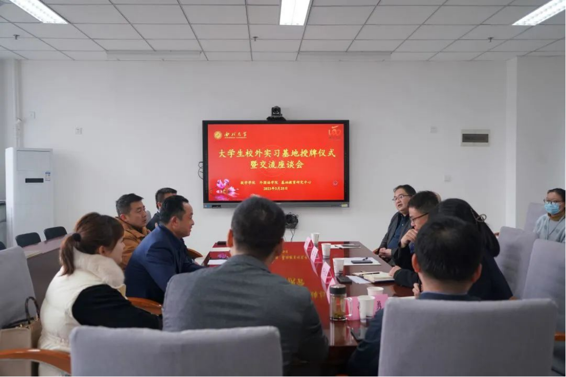 In order to implement the provincial and ministerial decisions and deployments regarding the employment of college graduates, and to carry out the “leader in charge” project for employment, actively connect with employers and deepen cooperation with multiple parties, on the morning of March 25th, the School of Mathematics, the School of Foreign Languages, and the Basic Education Research Center jointly hosted the ceremony for the unveiling of off-campus internship bases for college students and a seminar on enterprise visits and internships. The event was held in Room 317 of the East Building. Tang Caiwei, Principal of Huanggang Jinghe School in Xixian New District, Ma Jin, Director of the Office of High-Tech Fifth Senior High School, Jiang Chao, Director of the Office of High-Tech District Eleventh Junior High School, Tong Yaowei, Deputy Director of the Office of High-Tech District Third Junior High School, Wang Jun, Party Secretary of the School of Foreign Languages, Liu Jianbo, Deputy Party Secretary, Yang Funing, Executive Deputy Director of the Basic Education Research Center, Li Changhong, Party Secretary of the College of Mathematics, Shao Yong, Vice Dean, and graduation class counselors attended the event. Tian Hejun, Deputy Party Secretary of the School of Mathematics, presided over the ceremony.