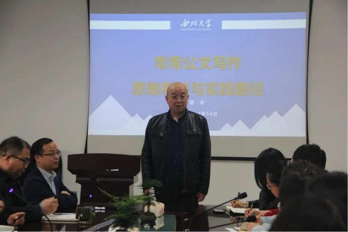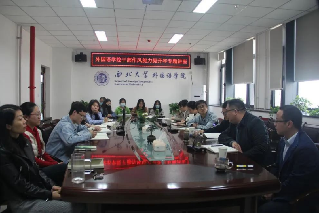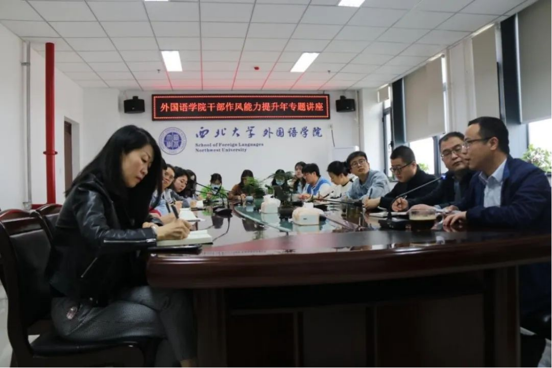 In order to thoroughly fulfill the Implementation Plan for the Improvement of Leadership Style and Ability at Northwest University and in accordance with the arrangements of the Implementation Plan for the Improvement of Leadership Style and Ability of the Party Committee of SFL, on the morning of March 30th, the Party Committee of the School invited Liang Mu, Deputy Director of  the Party Committee Office and the President’s Office of the University, to give a theme lecture. More than 20 members of the school’s leadership team, counselors and representatives of teachers and students attended the collective learning session. The lecture was chaired by Liu Jianbo, Deputy Secretary of the Party Committee of the School.