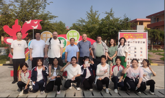 On September 14, 2023, Wang Jun, the secretary of School of Foreign Languages of Northwest University, led Robin Gilbank, a British foreign teacher, and Eli Smith, an American foreign teacher, to visit Gaoxin 16th Junior High School. The purpose of this visit was to give full play to the social benefits of the university's internationalized educational resources, to return to the community, to serve the public, to provide students with cross-cultural exchange experiences and to expand their international horizons.