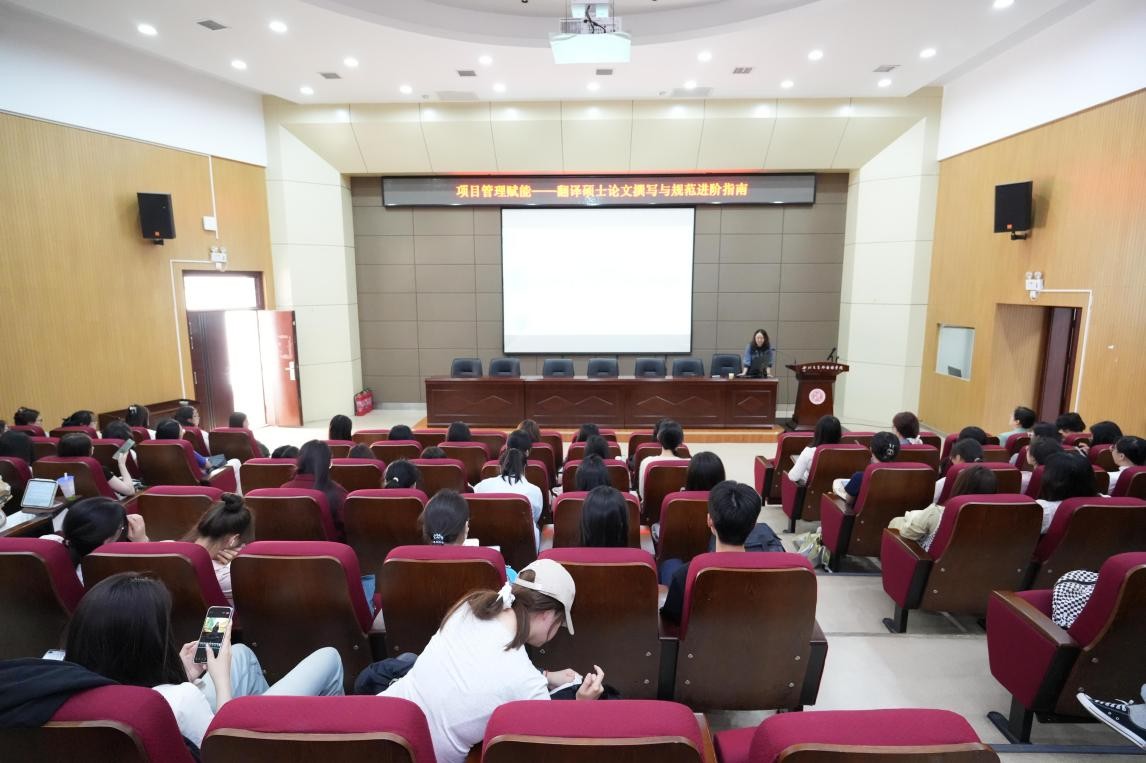 During the lecture, Director Chen Dong began by analyzing real translation master’s thesis cases and pointed out issues in thesis writing such as shallow analysis of translation examples, superficial exploration, weak argumentation, and vague understanding during the translation process, along with unclear comprehension and muddled connections. She also introduced the basic framework for thesis writing, helping students clarify the fundamental approach to writing a thesis. Following this, Ms. Chen Dong elaborated on the essential components of translation project management, outlining processes like standard management, content management, and tool management. She specifically emphasized that translation practice is a complete project management process, which involves important steps such as “recording the process, identifying problems, solving problems, categorizing and summarizing, merging similar items, and refining methods.” Finally, Director Chen Dong recommended several readings to our faculty and students, including The Translator’s Guide to Chinglish, Basic Standards for the Translation of Chinese Political Discourse into English, and Science Research Writing, to further assist them in their translation practice and thesis writing.