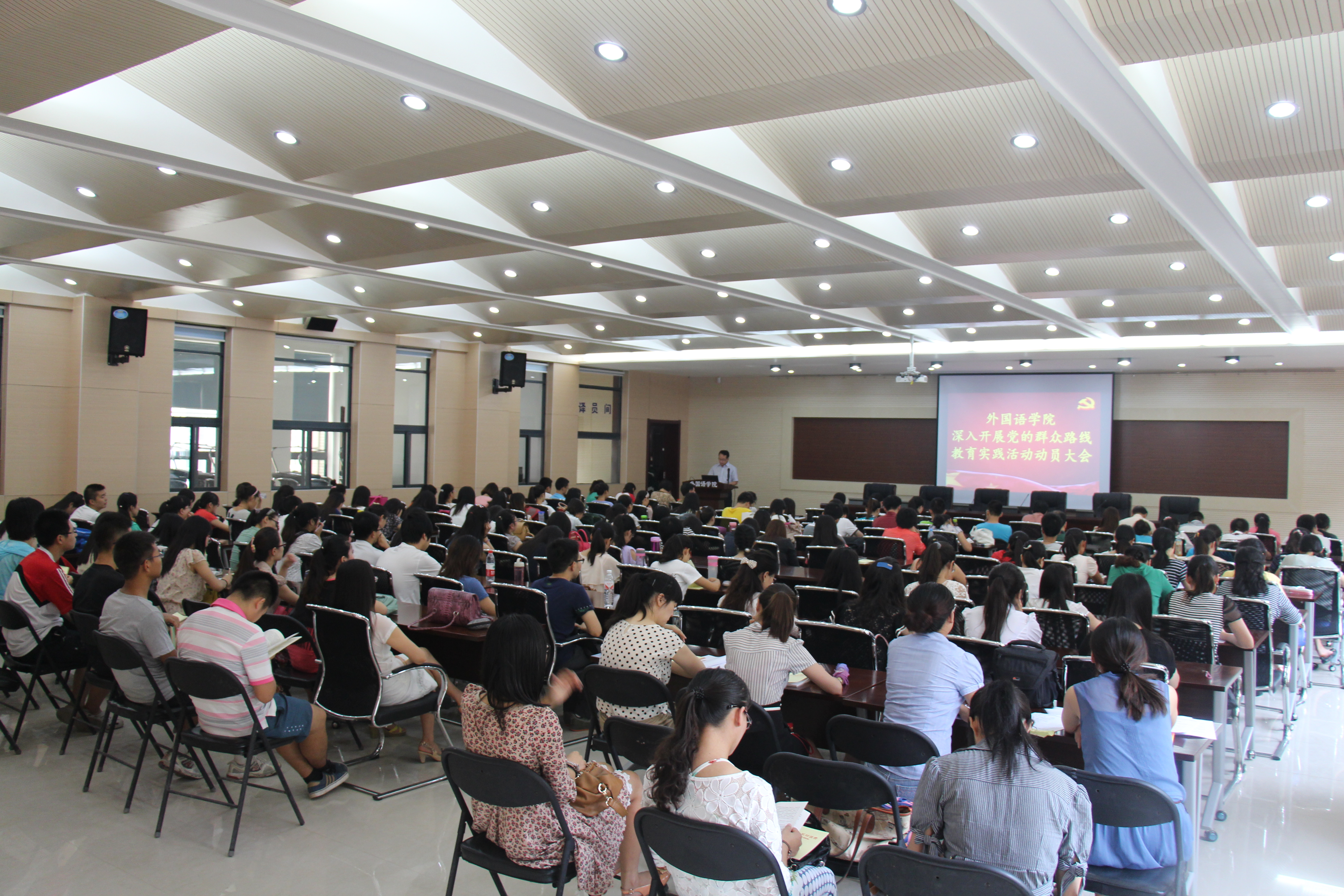 按照学校党委的群众路线教育实践活动的总体安排,     916下午 ,学院党委组织学院班子成员进行集中学习并认真研究讨论《外国语学院深入开展党的群众路线教育实践活动实施方案》。18日下午,学院党委召开全院党员大会,全面动员和认真部署党的群众路线教育实践活动,学院领导班子成员、党委委员、各支部书记、师生党员约150人参加会议。