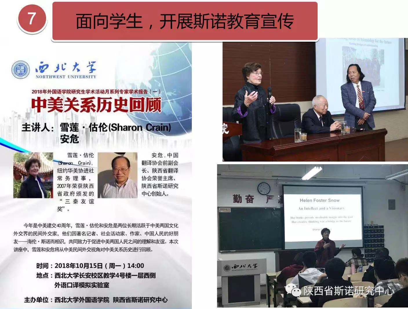 第七件事,10月中下旬的两个周,中心邀请安危老师和雪莲女士来西北大学做中美关系、两个斯诺的系列报告8场。安危老师讲了“忘年之交——海伦·斯诺和我”、“海伦·斯诺改变了我的人生”、“人民不会忘记”三场讲座。雪莲女士的五场讲座包括“中美关系历史回顾”、“积极的中美关系在当今的重要性”、“两个斯诺与中国”、“传承海伦·斯诺精神”和“中美教育”。我们邀请雪莲女士走进西北大学课堂,为学生讲解海伦故事和跨文化学习、英语学习的方法。