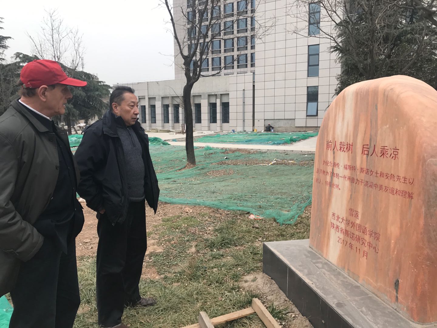 讲座之余,柯马凯一行在我院胡宗锋院长、院长助理Robin博士、季建芬教授、袁西玲老师的陪同下,参观了“海伦斯诺与安危友谊碑”和即将竣工的西学楼,考察我院规划的小剧场施工现场,提出初步的建设设计方案。柯马凯主席还参观了陕西省斯诺研究中心办公室,提出希望能与我院和斯诺研究中心合作,进行工合研究与展览项目的长期合作。