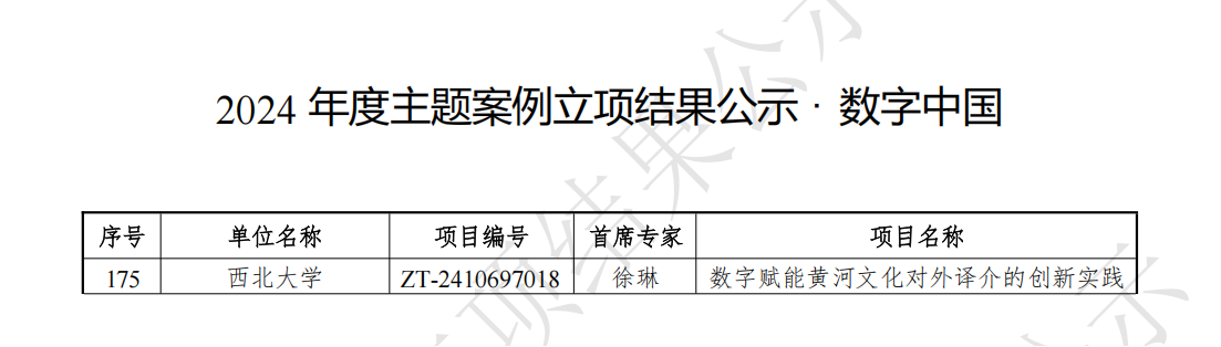 328日,教育部学位与研究生教育发展中心公示了2024年度中国专业学位案例中心主题案例立项,我院教师徐琳申报的数字赋能黄河文化对外译介的创新实践”获批主题案例。