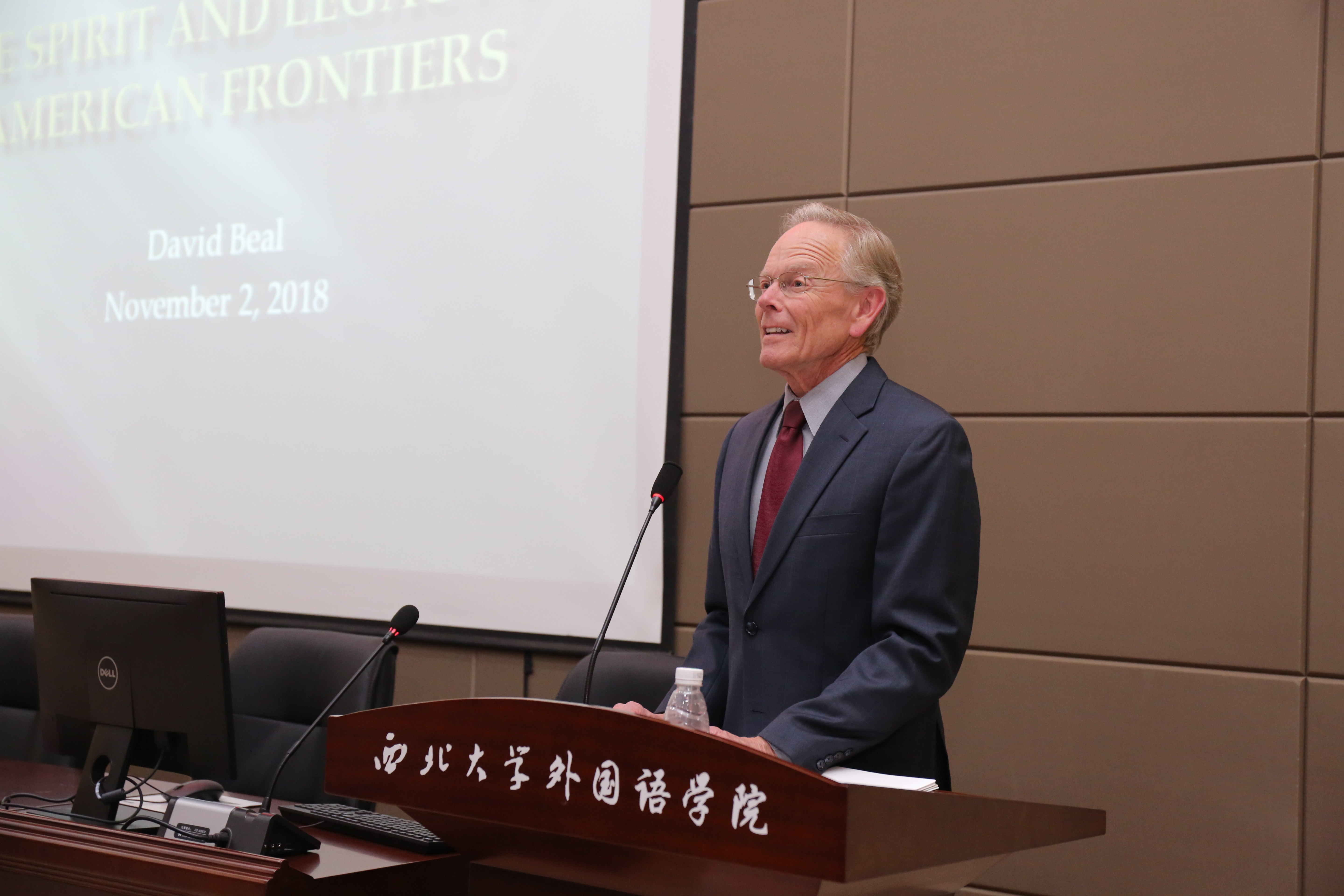 David Beal(大卫·比尔)从社会与文化角度出发,作了题为“美国的边境精神与遗产”的报告。他介绍了包括旧西方、路易斯安那州及太平洋沿岸等美国边境的情况,简述了以美国早期移民自由精神为代表的美国精神与遗产的广义范畴。此外,他也热情地分享了自己在中国的生活,并表示中美民间文化的不断交流是中美关系向前迈进的不竭动力。
