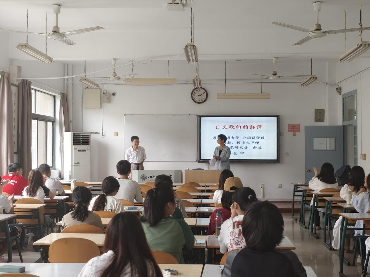 2025年7月10日上午,西安交通大学外国语学院教授、博士生导师,中日诗歌研究所所长金中教授做客必赢亚州242“名家讲座”,为师生作了题为“日本流行歌曲的翻译演唱”的讲座。讲座由杭正芳副教授主持。本次讲座亦是我院实践周系列活动之一,日语专业大一至大三的同学们参与聆听了讲座。