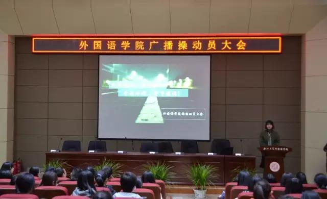 辅导员刘扬老师高度重视此次两操活动,事先做好详细的工作安排与部署,向同学们 详细介绍了两操情况,解答了同学们的疑问,鼓励大家珍惜大学时光、积极参加训操。刘老师指出:“两操比赛不仅仅是的技术动作的比拼,更是团体荣誉感、凝聚力的较量。期望同学们能端正态度, 认真训练,通过两操比赛提高身体素质,磨练自身意志,为外院再创佳绩。” 第二环节,全体学生观看了15级学生广播体操比赛视频,外院学子朝气蓬勃的形象、整齐划一的动作给同学们留下了深刻印象。此次两操赛事作为一次大型活动,每个人都表现出了前所未有的重视和空前的认真。本次大会在掌声中顺利有序地完成。