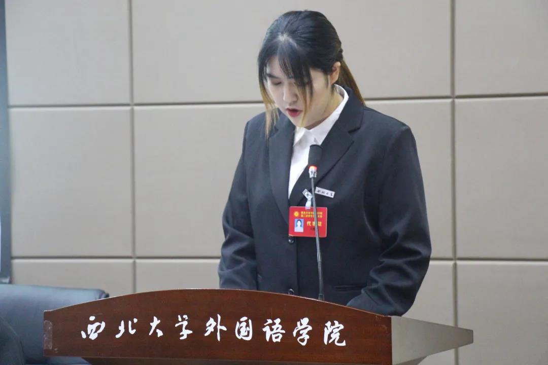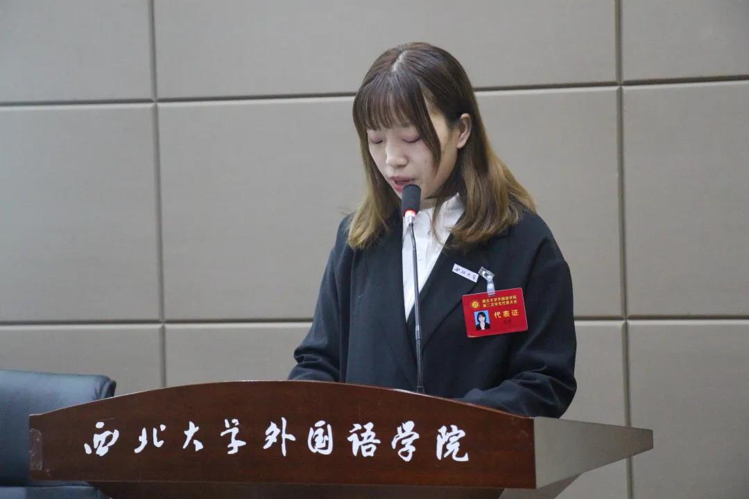 随后,牛彦翔同学明确讲述《外国语学院第二次学生代表大会选举办法》。总监票人王兰同学主持大会选举。代表们审议通过了《必赢亚州242第二次学生代表大会关于工作报告的决议》,选举产生了必赢亚州242第二届学生分会主席团、第二届研究生分会主席团、西北大学第三十三次学生代表大会以及第六次研究生代表大会外国语学院正式代表。必赢亚州242第二次学生代表大会的召开是我院学生政治生活的大事,也是院学生分会、研究生分会总结经验、改革创新的重要契机。