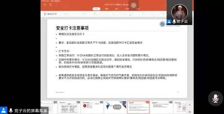 之后,院团委实践创新部门的党子云再次详细讲解了12日上午校团委开展的寒假实践培训会议重点。其中包括提交文字、图片、视频稿件的格式要求、提交要求;宣传管理流程及要求;结项所需成果;实践评优标准;安全打卡;寒假实践情况登记表填写方式;实践途中突发情况的解决方式;报销项目及流程等问题。