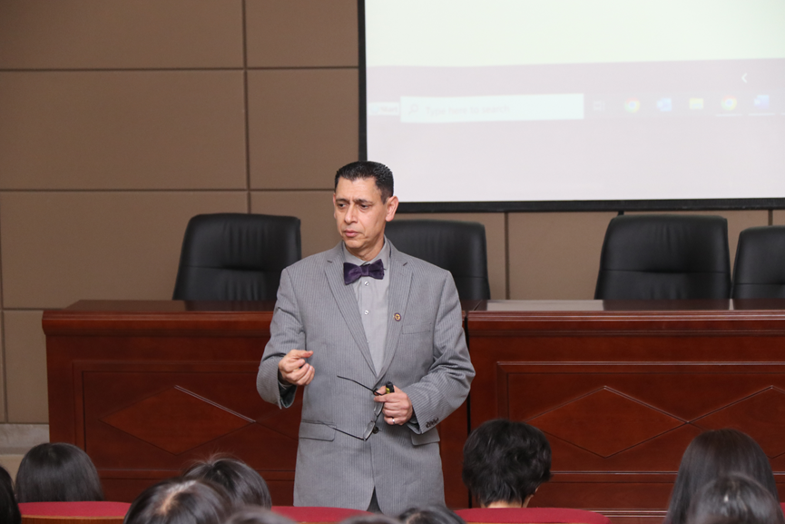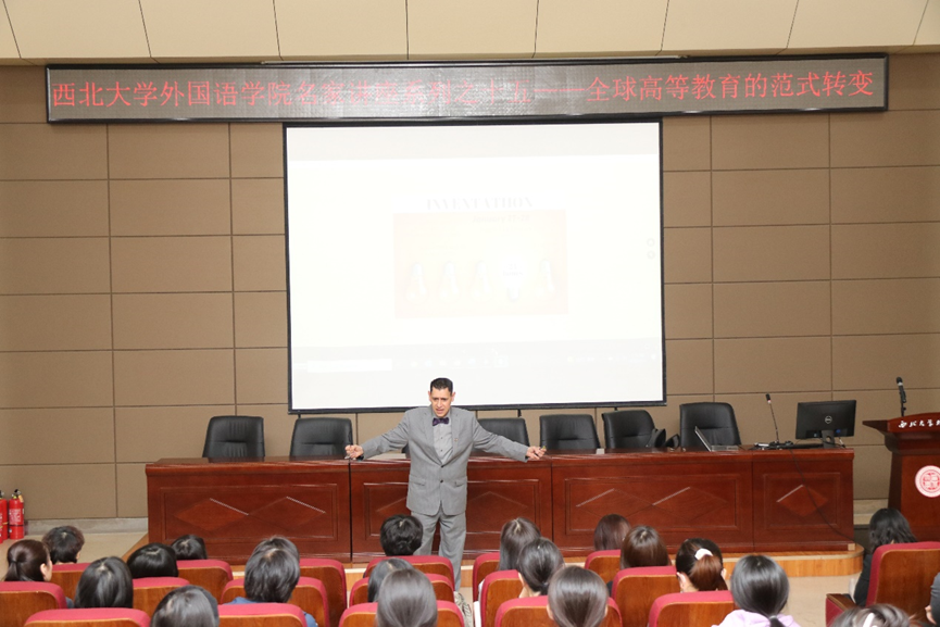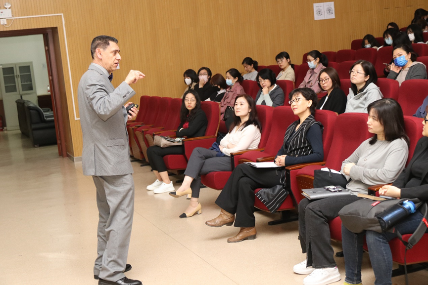 首先,曹若男院长对Ray Taheri教授的到来表示欢迎,并简要介绍了他的学术背景及卓越成就。随后,Taheri教授通过生动的图片展示、数据分析、问答互动扥等方式热情洋溢、深入浅出地分析全球高等教育发生的深刻变革及其对教育工作者,尤其是高校外语教师所提出的新的挑战和要求。最后,Taheri教授与我院教师进行了亲切友好的互动交流,对于教师所关心的教学方法、教学技巧等问题做了详细的解答,共同探讨了新的教学理念在具体教学实践中的应用。