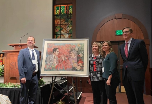 仪式上,海伦·福斯特·斯诺基金会主席Adam Foster为南犹他大学赠送旅美画家郭轶丹女士创作的绢画《忘年之交》复制品。这幅画的原件创作于2017年。郭轶丹女士在南犹他大学“海伦日”庆典时,将这幅画赠送给海伦·斯诺的“忘年之交”安危先生。回国后,安危先生将其赠送给陕西斯诺研究中心。