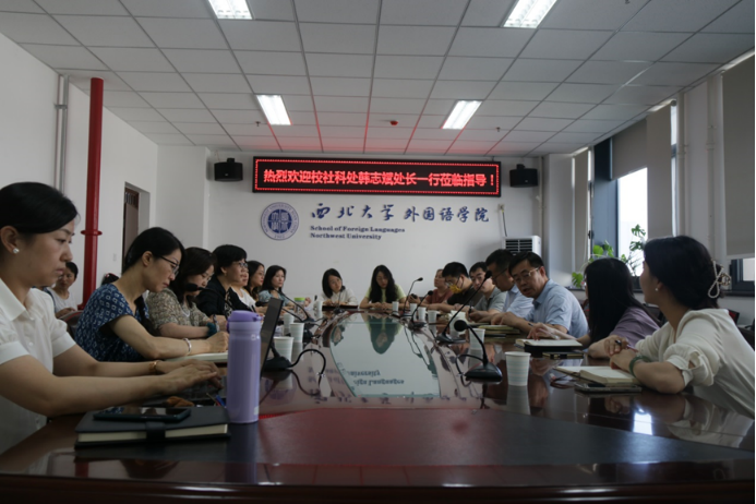 2022年6月24日上午,西北大学社科处处长韩志斌,副处长李丰庆一行到外国语学院就“一院一策”制定中期刊目录修订、社科成果认定等情况进行专题调研。外国语学院党政负责人、教师代表参加了调研座谈。