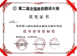 2021年7月18-19日,由全国翻译专业学位研究生教育指导委员会、中外语言文化对比研究会和上海对外经贸大学共同举办的“第二届全国商务翻译大赛”决赛和颁奖仪式在上海对外经贸大学举行。我院英语专业2018级学生王浩琛同学喜获汉译英组二等奖,于亚莉老师获优秀指导教师奖,我校获优秀组织奖。