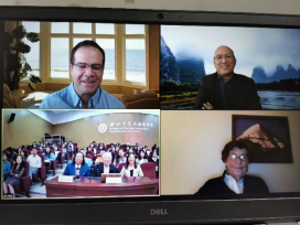 美方与会发言嘉宾包括犹他州世界贸易中心总裁迈尔克·汉森,杨百翰大学教育心理学与技术学院兼职副教授陈可辛,国际经济桥执行董事丹·史蒂芬森,中美关系研究专家雪莲。中方发言嘉宾是陕西省斯诺研究中心创始人安危先生和陕西省斯诺研究中心主任、我院院长胡宗锋教授。我院斯诺中心代表袁西玲、陈娟、高敏娜,外籍教师代表Robin Gilbank、Matthew、研究生秘书徐琳、2020级全体研究生、国际友人RED记忆讲解队成员参加并旁听了会议。
