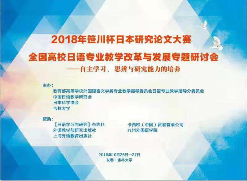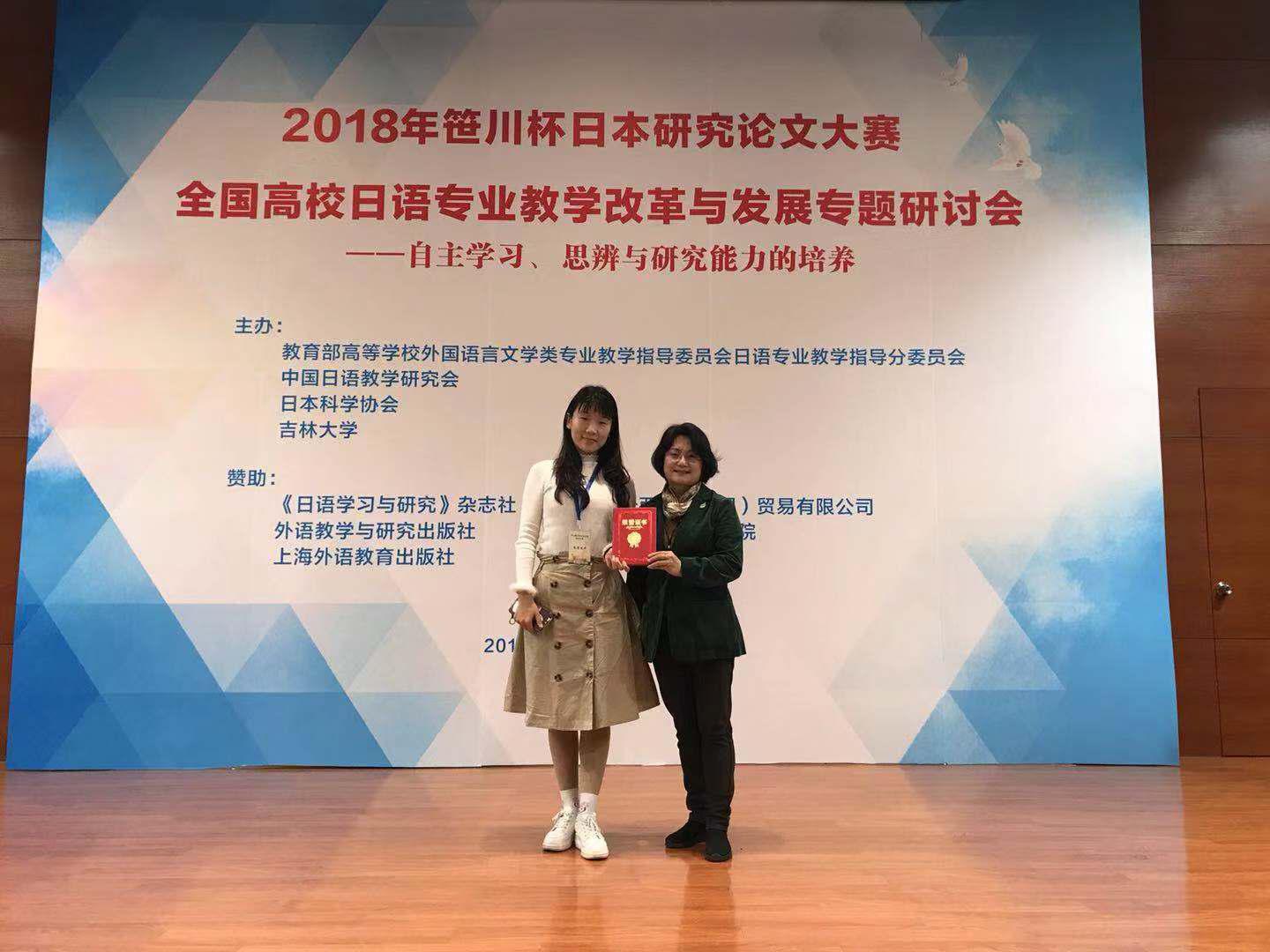 2018年10月27日,在吉林大学举行的全国首届笹川杯大学生日本研究论文大赛中,由我校外国语学院薛红玲老师指导的日语系2015级许凯欣同学获得文化组三等奖。