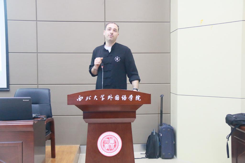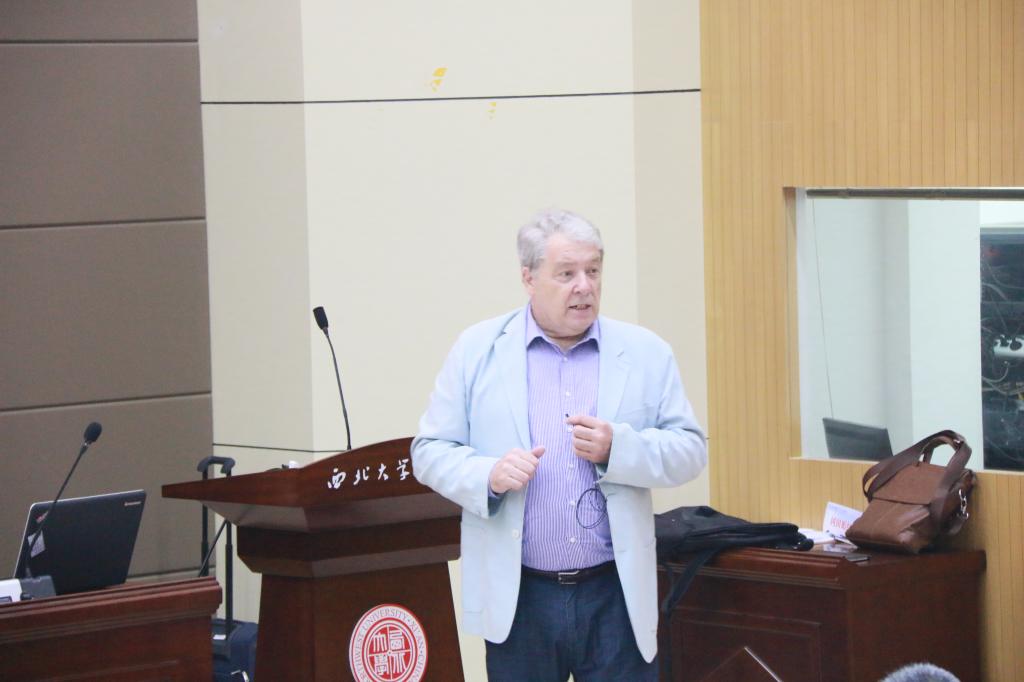 下午的发言由我校原英语系教师、现浙江师范大学交流学院院长李贵苍教授主持。陕西省翻译协会原主席安危先生做了题为《翻译与文明交往》的报告。介绍了陕西文学走出去的翻译项目计划与西北大学以胡宗锋教授和Robin为首席专家的翻译团队。下午的最后一位发言者是我院院长胡宗锋教授的题为《文学的“请进来”与“冲出去”》的报告。