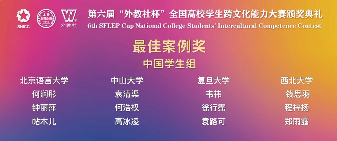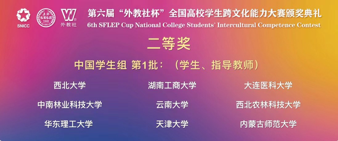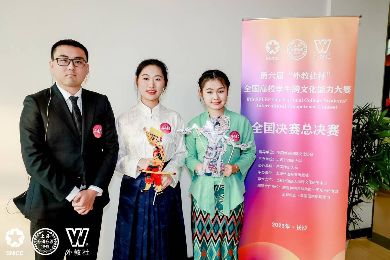 2023年12月3日,第六届“外教社杯”全国高校学生跨文化能力大赛全国决赛、总决赛在湖南师范大学圆满落幕。在我校外国语学院教师张欣、宣菁、赵丹晨的精心指导下,由20级英语专业程梓扬、22级图书馆学郑雨露、22级历史学(基地班)钱思羽三位学生组成的队伍代表陕西省在决赛中获得中国学生组全国二等奖和最佳案例奖,为我校参与该项赛事以来获得的最好成绩,也是本次大赛陕西省最好成绩。