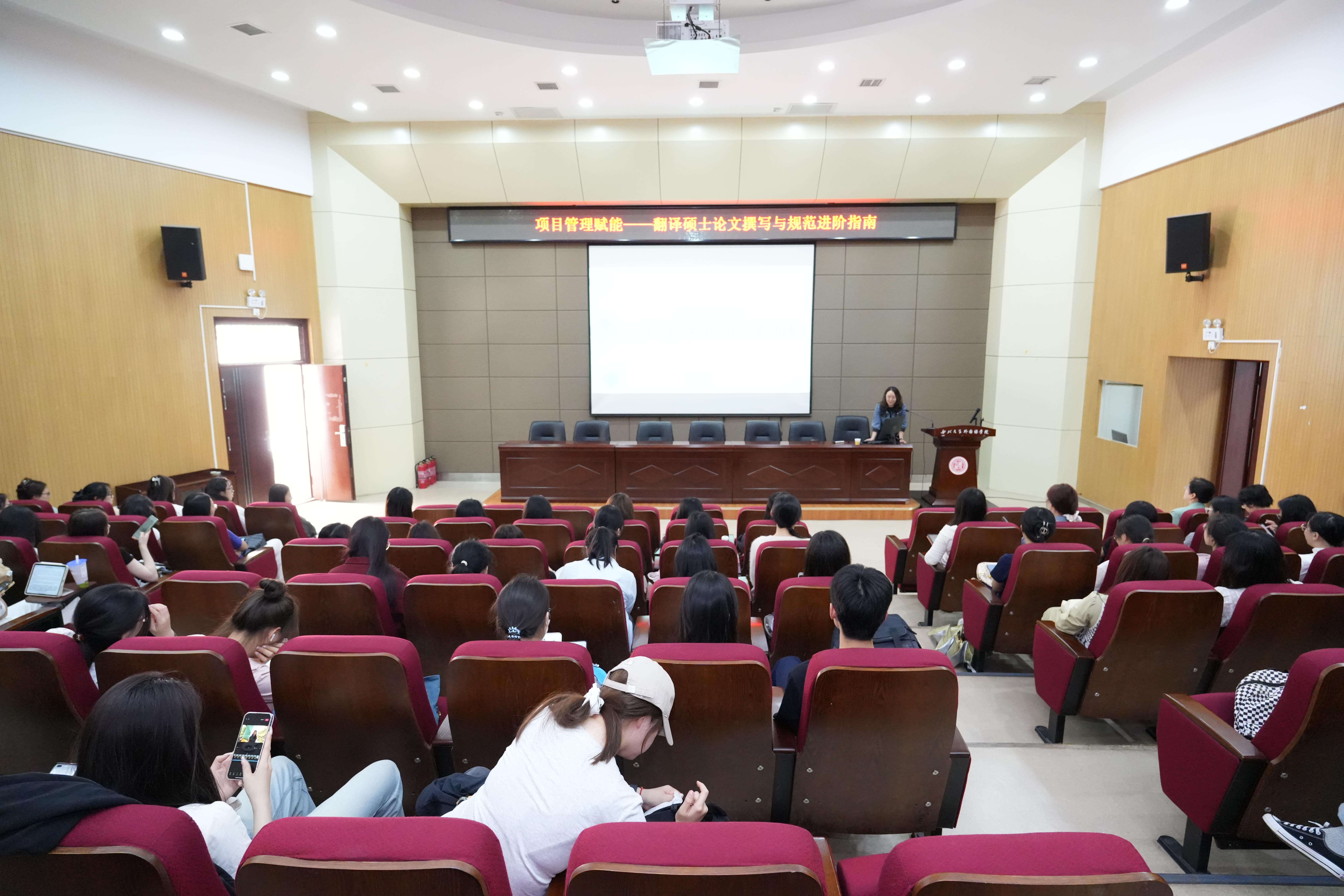 在讲座中,陈栋总监首先通过对真实翻译硕士研究生毕业论文的案例分析,指出翻译硕士论文写作中存在的诸如翻译示例剖析浅薄、探究粗疏、论证浮泛,以及翻译过程中理解疏浅、领会模糊、环节含混等问题,并介绍了论文写作的基本框架,为同学们理清了论文撰写的基本思路。接着,陈栋总监阐述了翻译项目管理的基本内容,说明翻译项目管理中的标准管理、内容管理、工具管理等流程。陈栋总监特别强调翻译实践属于完整的项目管理过程,需要完成“记录过程、发现问题、解决问题、分类汇总、合并同类项以及提炼方法”等重要环节。最后,陈栋总监向我院师生推荐了《中式英语之鉴》《中国时政话语翻译基本规范·英文》以及Science Research Writing等阅读书目,以便更好地助力师生的翻译实践与论文写作。